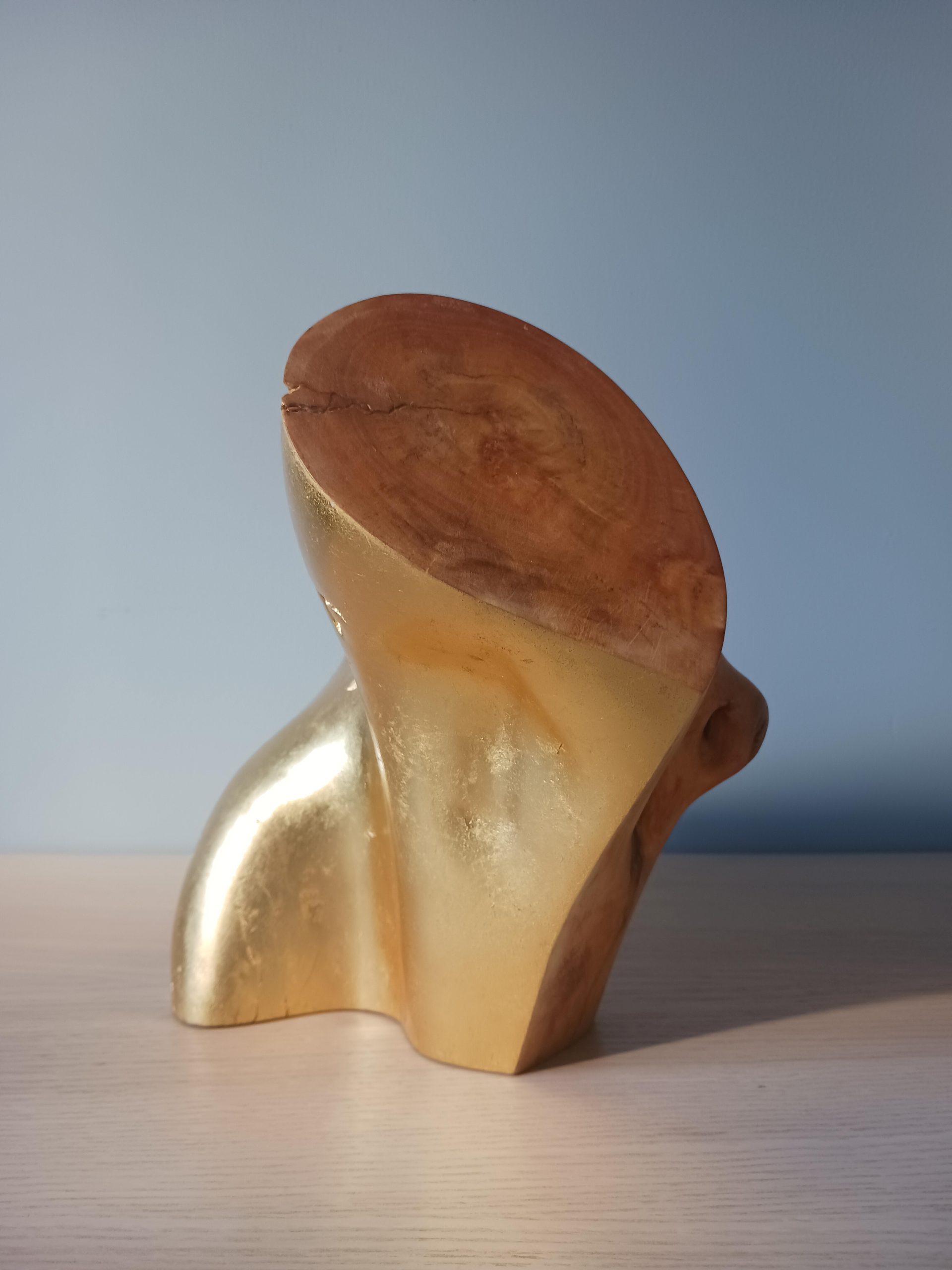 Escultura de madeira com um lado suave e encerado e outro arruinado e dourado.
